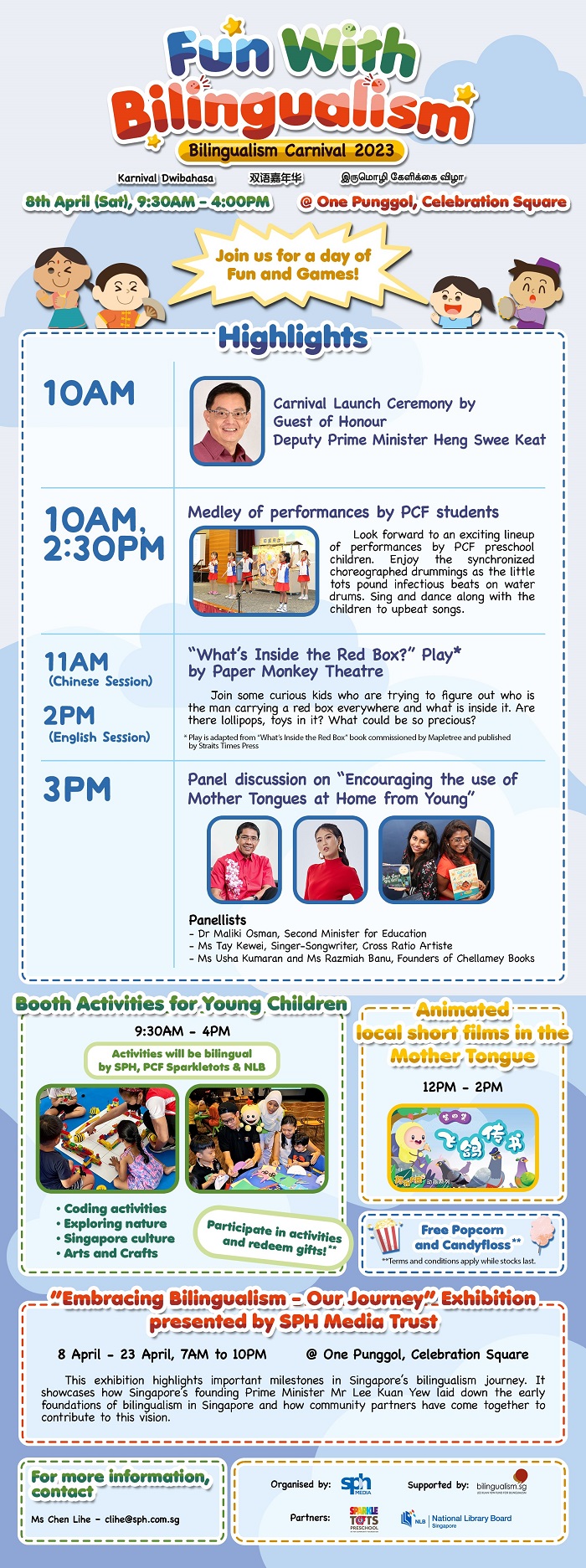Drawing from the perspectives of academics, educators, curriculum specialists and media personalities to share insights in promoting MTL literacy and appreciation, there will be 19 sharing sessions for parents and educators, and 26 interactive workshops for parent-child bonding.For more information, visit www.mtls.edu.sg now!