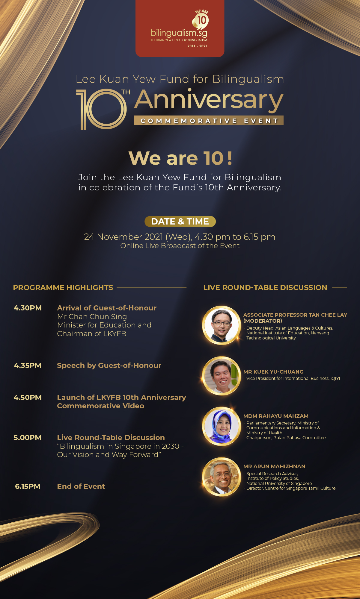 To mark the Fund's 10th year milestone, the Commemorative Video, tracing the Fund's journey since inception, will be launched. Centered on the theme "Bilingualism in Singapore 2030 - Our Vision and Way Forward", experts and practitioners will share their insights on their personal experiences in learning to be effective bilinguals, the importance of bilingualism for individuals, and the impact of bilingualism in the community and beyond.